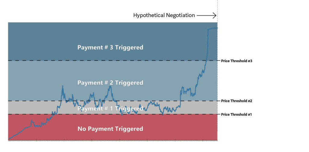 Figure 1 shows stock price (blue line) over time relative to certain payment-triggering price thresholds as specified in the prior agreement.
