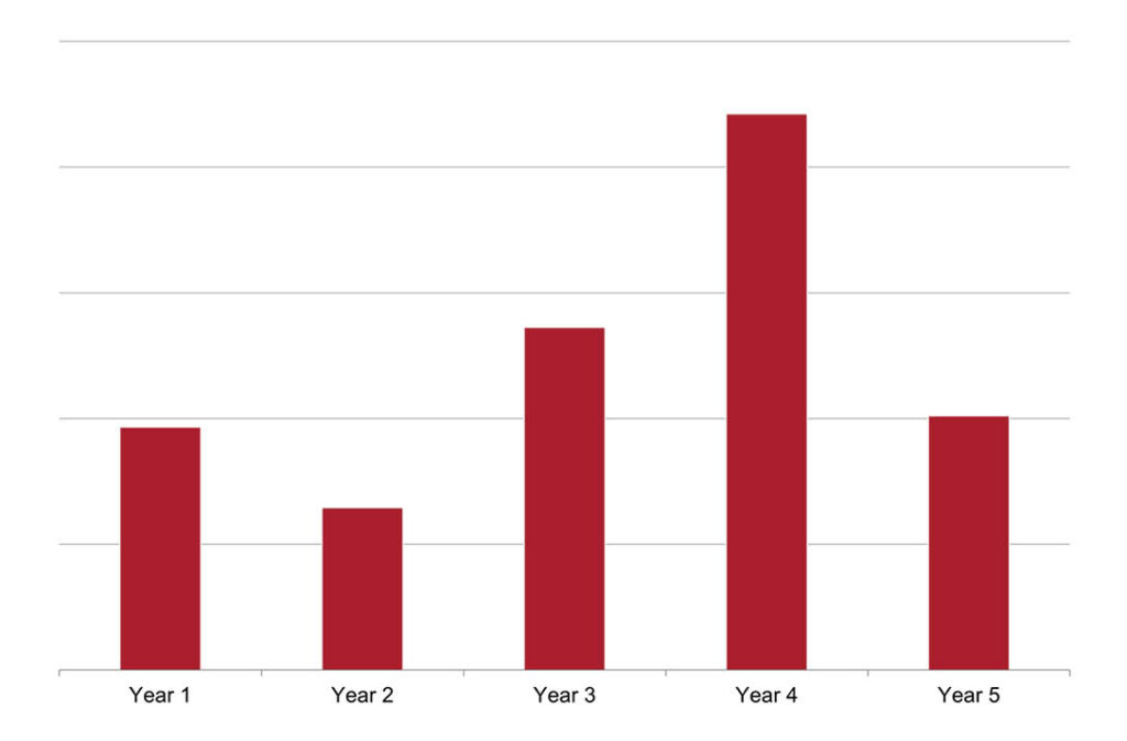 Figure 4 shows the estimated profits lost during each year shown in Figure 3 under a launch delay scenario; Year 5 reflects profits lost through patent expiration