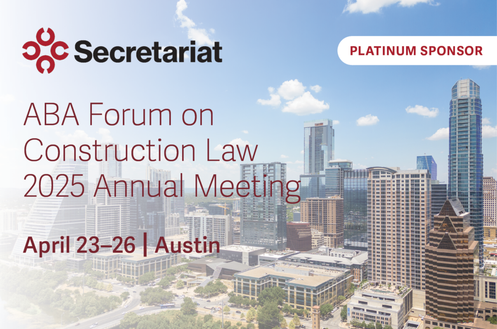 Secretariat is proud to be a Platinum Sponsor of the ABA Forum on Construction Law Annual Meeting. We look forward to joining members of the Forum in Austin April 23–26. Attendees will be exploring the world of construction under the theme, “Return of the Contractors — Transforming the Construction Landscape.”