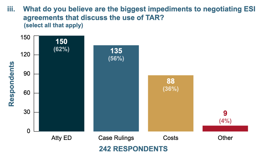 A troubling pattern of poorly constructed Electronically Stored Information (ESI) agreements came out in both the 2023 and 2024 surveys. These agreements have often led to significant downstream issues, including not foreseeing future data types and by increasing costs by agreeing to restrictive document review protocols. The findings emphasized the need for more careful negotiation and drafting of ESI protocols to minimize complications and disputes later in discovery.