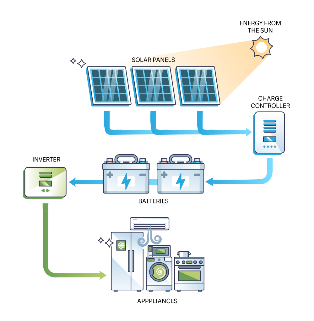 Solar panel systems produce DC voltage and use inverters to convert electrical power to AC voltage. Inverters are susceptible to fire risks and power efficiency losses through exposure to environmental conditions. Power quality can be reduced without proper synchronization of frequency and voltage. Harmonic distortions from nearby equipment can also degrade the quality of the electrical power. Monitoring the solar panel control system is key to maintaining efficiency and load balancing with battery storage systems.