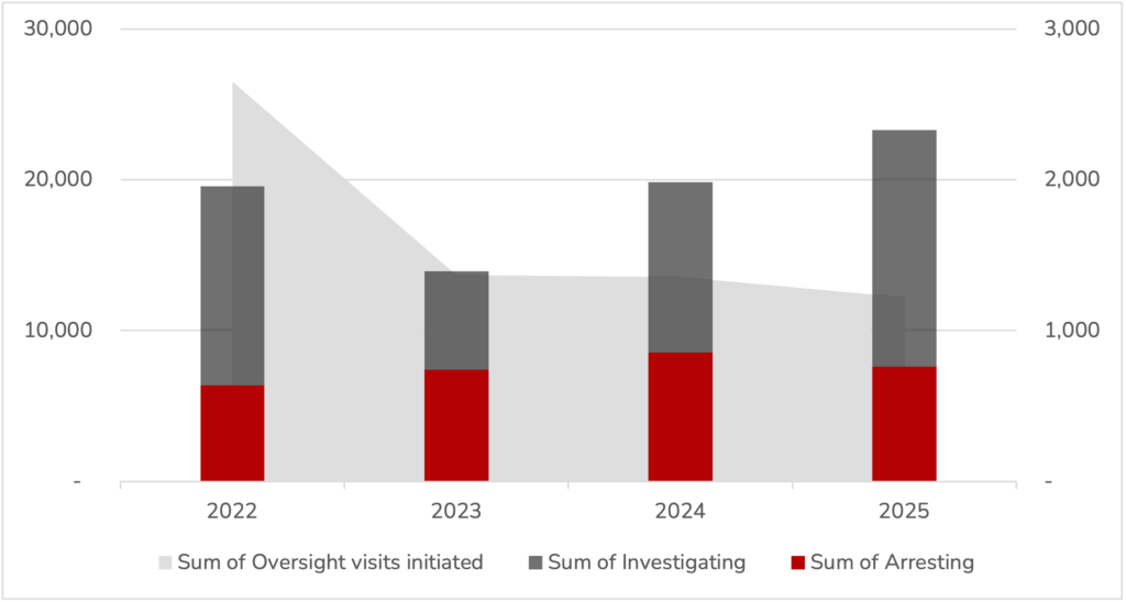 While the number of visits has slightly declined, investigative actions have reached their highest level over the four-year period. Arrest figures remain consistent, reflecting sustained legal enforcement.