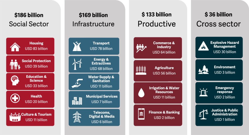 The cost of Ukraine’s reconstruction and recovery is now estimated at USD 524 billion (up from USD 486 billion), an increase of 8%, according to the Fourth Rapid Damage and Needs Assessment (RDNA4) published in February 2025. The Strategic Investment Council (SIC) in Ukraine, with the support of donor funds, has allocated USD 7.37 billion towards redevelopment of the above identified. Despite these efforts, a significant financing gap remains, highlighting the need for continued and increasing international support. Ukraine’s sector wise summary of needs is represented in the chart below: