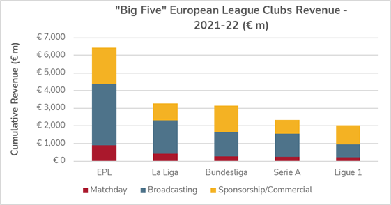 As depicted in the figure above, broadcasting revenue is the largest source of revenue for sports teams across “Big Five” European leagues, contributing approximately half of the team’s revenue. Followed by commercial revenue, which contributes about a third of the revenues, and then matchday revenue.