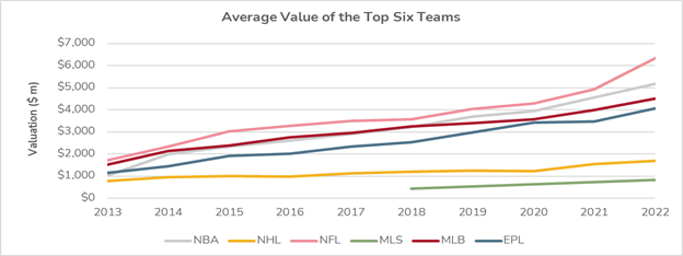 Sports are everywhere and we consume sports played across the globe more than ever before. Ultimately, sports teams are businesses, so it is not surprising that the value of sports teams has increased given the rising popularity and expansion into new global markets. A summary of the growth in value of the top 6 teams in the American Major Leagues[1] and the English Premier League (“EPL” or “Premier League”) from 2013 to 2022 is provided below.[2],[3]